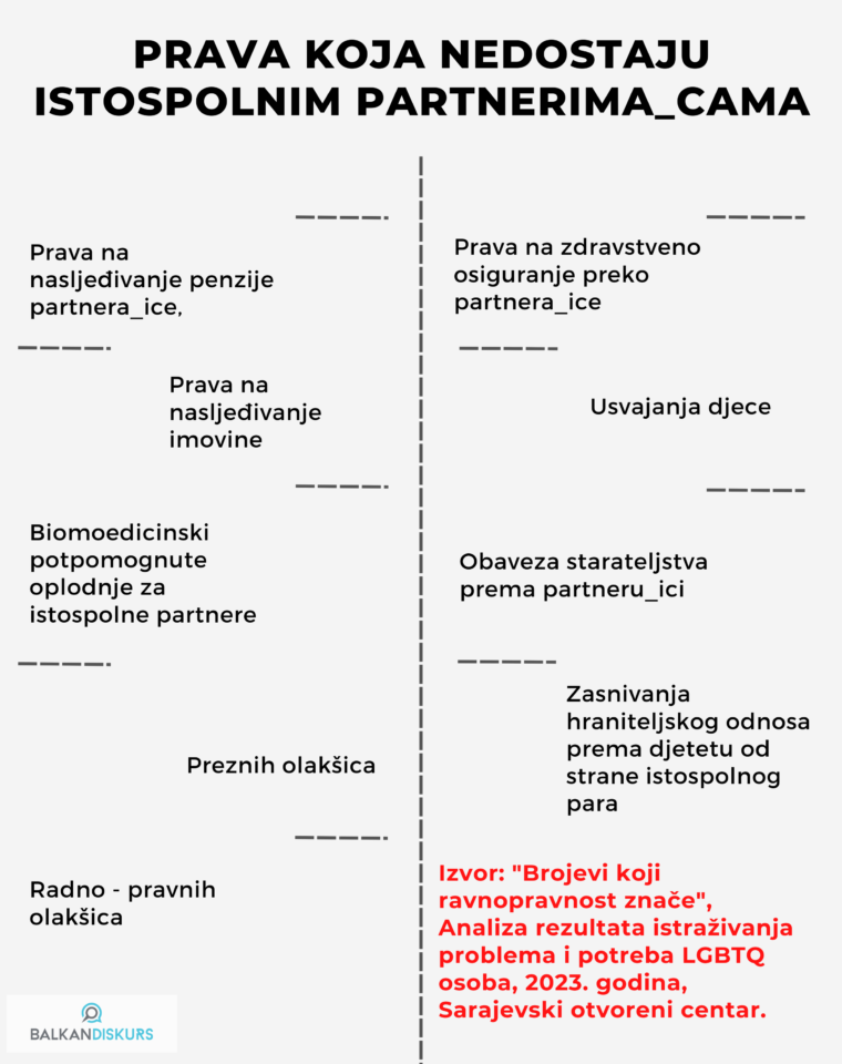 Međutim, kada su ispitanicima predočena prava koja su nedostupna istospolnim partnerima, poput prava na zdravstveno osiguranje, prava na posjetu bolesnom partneru, poreske olakšice, nasljeđivanje imovine i penzije, obaveze uzdržavanja, pravo na starateljstvo nad biološkim djetetom partnera/ice, većina ispitanika smatra da ih trebaju uživati. Prema pojašnjenju Brkovića, podrška ispitanika/ica se smanjila kod pitanja usvajanja djece. Podsjetio je da se pred Ustavnim sudom Bosne i Hercegovine vodi postupak zbog toga što osoba nije mogla naslijediti pravo svoje preminule partnerice iz istospolne veze.